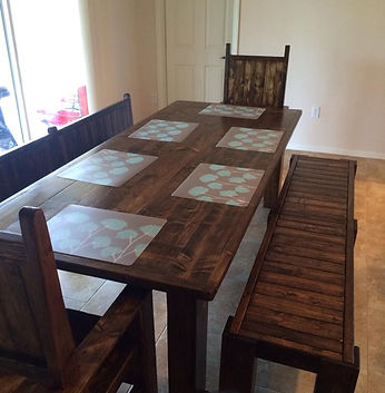 This beautiful 8' Farmhouse style set was created for the family with small children. It's centerpiece is a 8' x 42" farmhouse style table with thick wrapped legs using lumber from an old farmhouse. The bench with a back was made narrower to allow children to enjoy setting at the table comfortably.